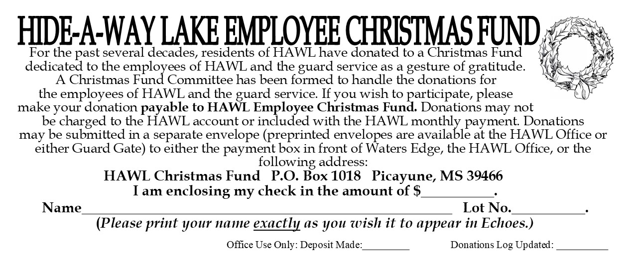 For the past several decades, residents of HAWL have donated to a Christmas Fund dedicated to the employees of HAWL and the guard service as a gesture of gratitude. A Christmas Fund Committee has been formed to handle the donations for the employees of HAWL and the guard service. If you wish to participate, please complete the donation form make your donation payable to HAWL Employee Christmas Fund. Donations may not be charged to the HAWL account or included with the HAWL monthly payment. Donations may be submitted in a separate envelope (preprinted envelopes are available at the HAWL Office or either Guard Gate) to either the payment box in front of Waters Edge, the HAWL Office, or the following address: HAWL Christmas Fund P.O. Box 1018 Picayune, MS 39466.